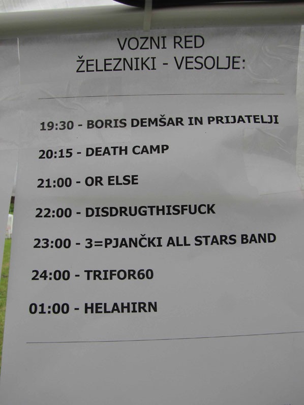 DISDRUG THIS FUCK (Železniki/SLO)DRY HEAVES (Sheffield/UK)SKIPLICKERS (Sheffield/UK)RODOLJUBAC (Tmin/SLO)FAST RESPONSE (Zg/CRO)PIGS PARLAMENT (Goriška Brda/SLO) STRGANE PAZDUHE (Ravne na Koroškem/SLO)OR ELSE (Železniki/SLO)3=PJANČKI (Železniki/SLO)LE SERPENTINE (Kranj/SLO)BLACKOUT (Postojna/SLO)BERNYS PROPAGANDA(Skopje/MK)